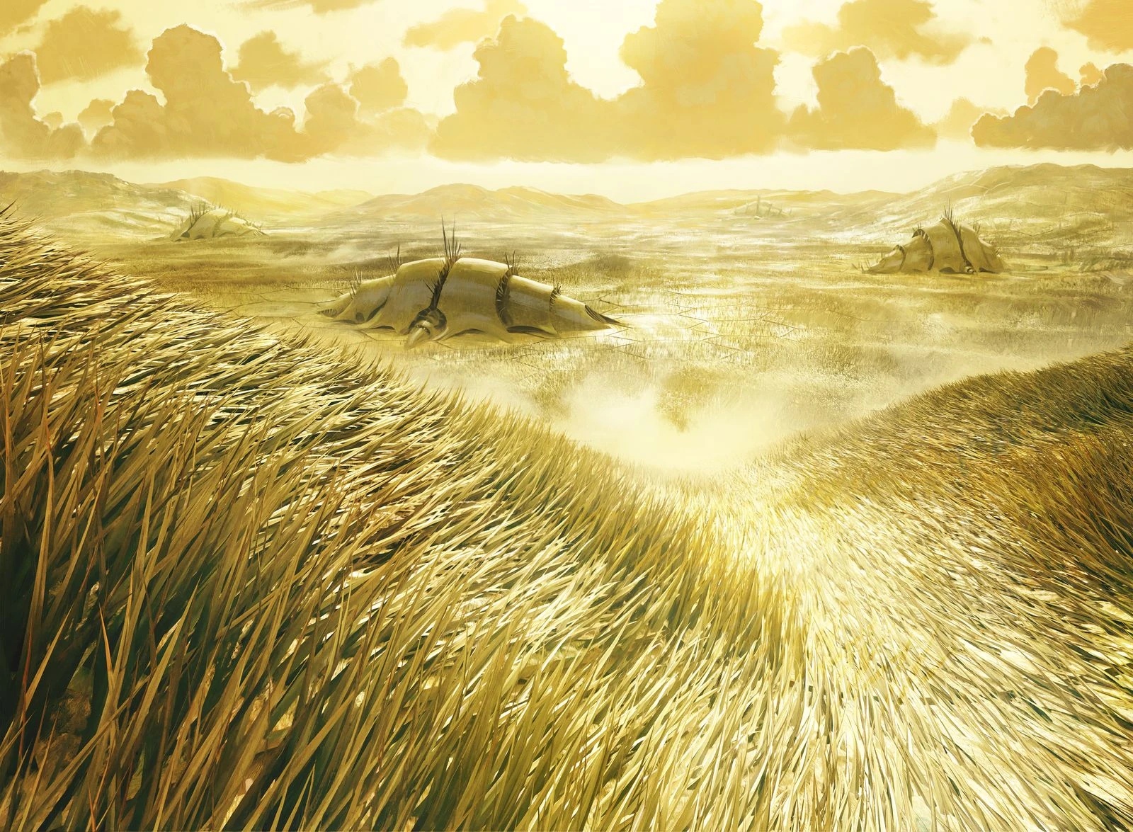 Situata al centro dei Campi sorgeva Taj-Nar, costruita sopra la Caverna della Luce, e per questo fu scelta come capitale dai Leonid. I nomadi Auriok vagavano per queste pianure, commerciando con coloro che incontrano con giusto alcuni insediamenti fissi come Dieci Scudi e Rifugio delle Lame. Gli pteron si libravano nei cieli sopra i Campi Taglienti.