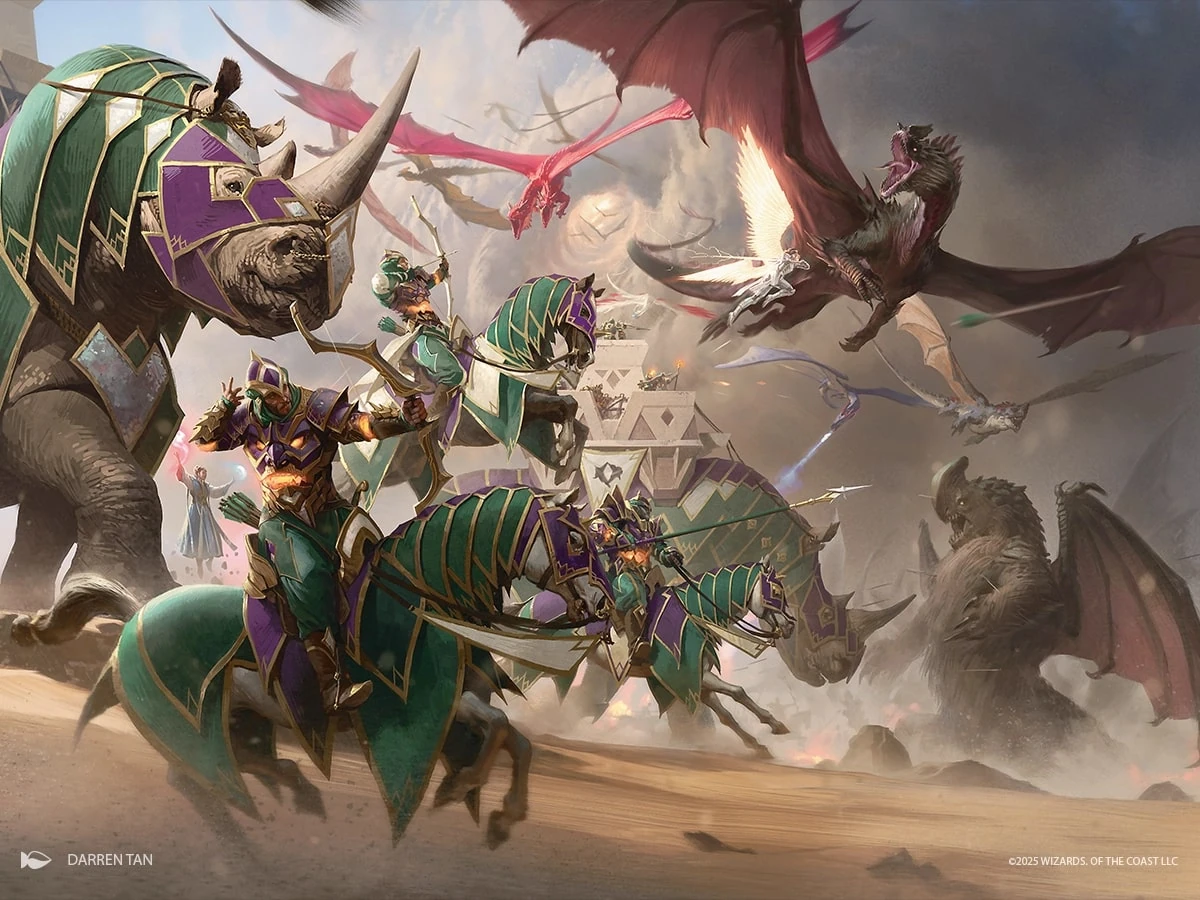 Mentre Ajani e Narset parlavano con Sarkhan, Elspeth provò a rimanere in volo ma sfinita iniziò a precipitare a terra seguita poi dal gigantesco drago intenzionato a finirla. Fortunatamente per lei venne afferrata da Ajani mentre il drago Abzan in cui si trovava schivò Sarkhan allontanandosi dalla sua portata. L'arcangelo chiese se fosse venuto per rimediare alle sue morti passate e il leonid rispose che si trovava lì per combattere con lei nel presente. Con loro c'era anche Narset ed Eslpeth suggerì un ultimo attacco disperato per accecare Sarkhan e la Jeskai disse che poteva farlo lei dal momento che era in grado di vedere gli schemi dei movimenti del drago gigante.