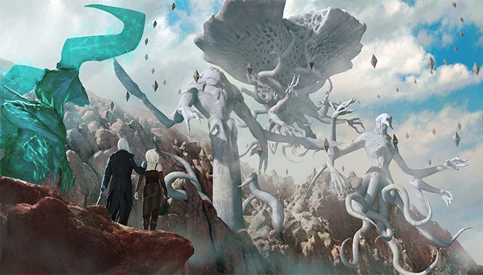 Durante i loro viaggi nel multiverso, Sorin e Nahiri incrociarono la strada con una minaccia che non riuscivano a comprendere: misteriose creature che stavano consumando il mana di un piano senza nome. Comprendendo il pericolo che rappresentavano, Sorin decise di fermarli per evitare che un giorno potessero invadere anche Innistrad, mentre Nahiri per difendere gli abitanti di quel piano. Il vampiro disapprovo la kor perchè convinto che insieme potevano eliminare quei divoratori, ma non potevano garantire la sicurezza di quelle persone allo stesso tempo. In risposta alle sue parole lei creò con la sua magia una spada per Lian per incoraggiare i sopravvissuti. A bassa voce Sorin disse che immaginava che la falsa speranza fosse meglio di niente e Nahiri replicò che qualsiasi speranza era sempre meglio di niente. Lei si allontanò per terminare di preparare l'ennesimo rifugio e, prima che lui potesse replicare, la terra tremò. Entrambi videro arrivare gli abomini guidati da un immenso araldo.